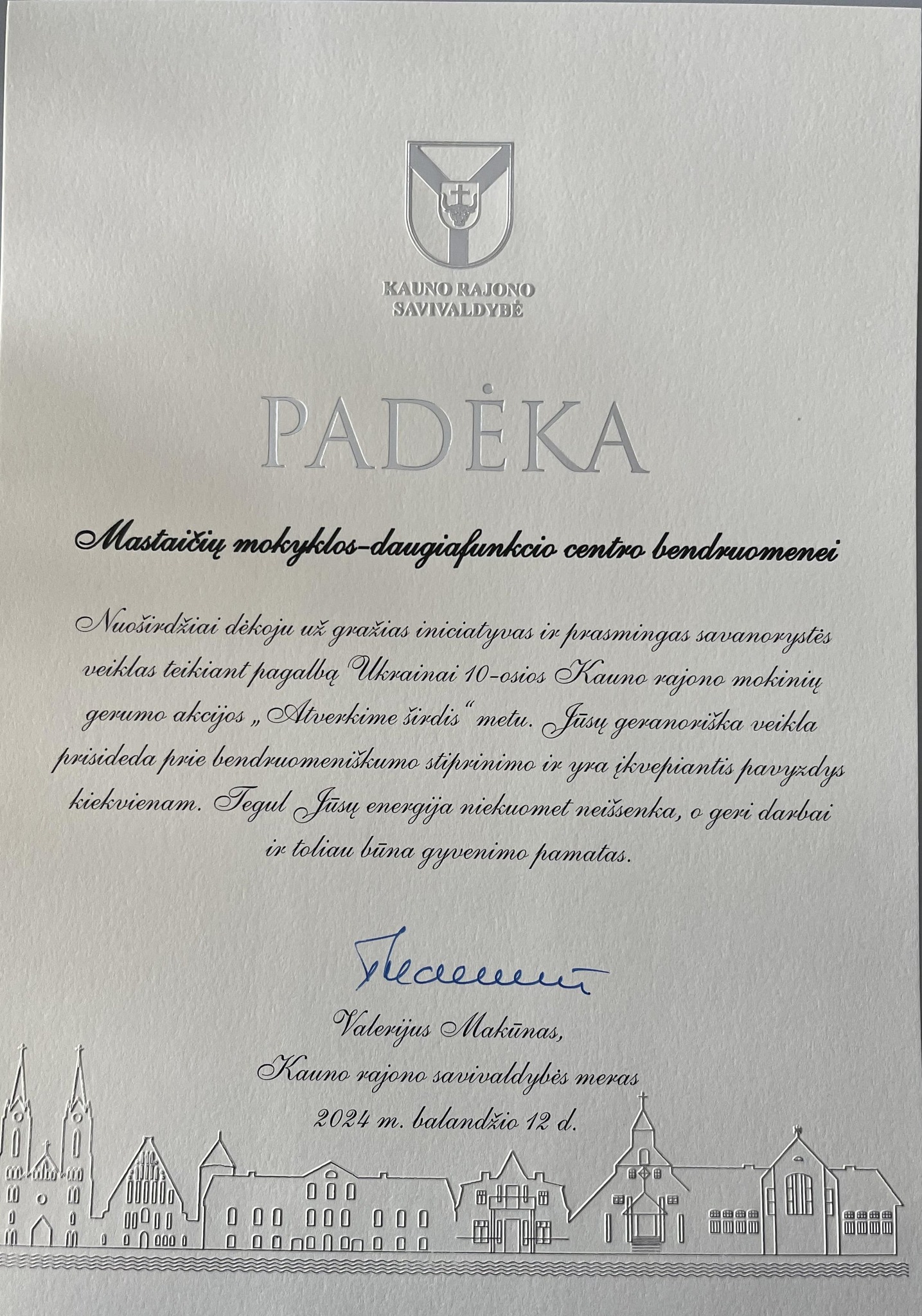 Renginio metu buvo pristatyti vaikų ir kitų įstaigų bendruomenių narių nuveikti geri darbai, pasidalinta gerąja patirtimi. Kauno r. Mastaičių mokyklos daugiafunkcio centro bendruomenei įteikta Kauno rajono savivaldybės mero Valerijaus Makūno padėka.